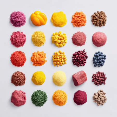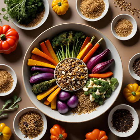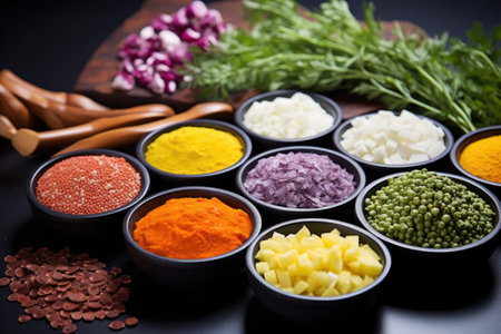 A vibrant display of various ingredients including spices, grains, and vegetables, ideal for culinary projects, food photography, and healthy cooking inspiration.