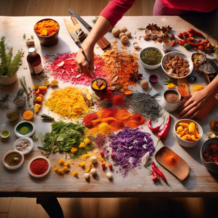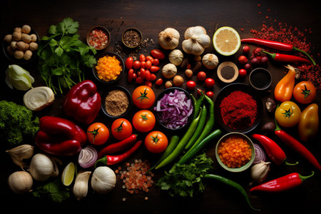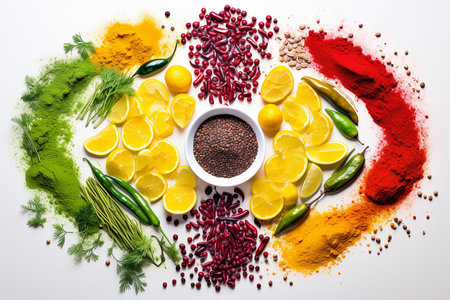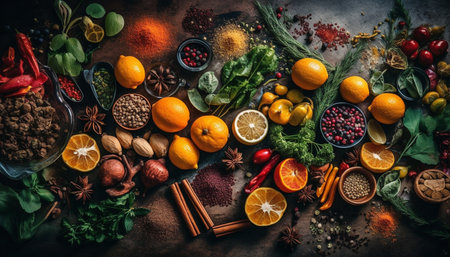A vibrant collection of organic spices in a high angle view generated by artificial intelligence