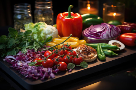 Cutting board with colorful vegetables on a clean kitchen countertop., generative AI