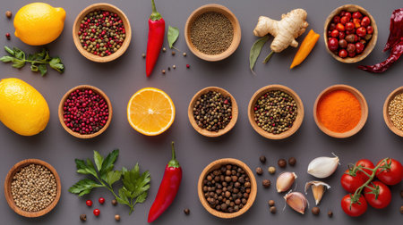 A vibrant and artistic arrangement of spices, herbs, and citrus fruits on a gray surface, perfect for culinary inspirations, food photography, and healthy ingredient displays.