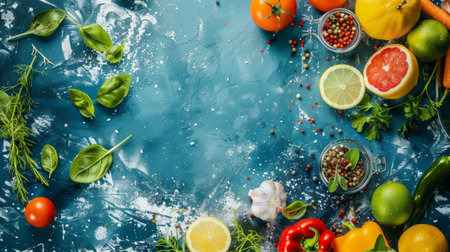 Top view of fresh ingredients and spices, including citrus fruits, herbs, and vegetables, spread on a textured blue background.
