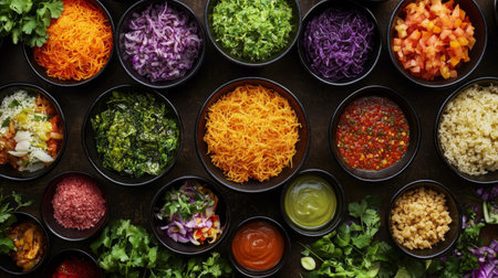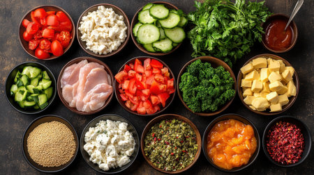 An inviting arrangement of colorful ingredients in small bowls perfect for meal preparation or gatherings. This vibrant display highlights fresh vegetables, cheeses, and condiments.