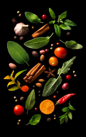 Captivating mix of colorful spices, aromatic herbs, and elegant kitchen utensils on sleek black backdrop