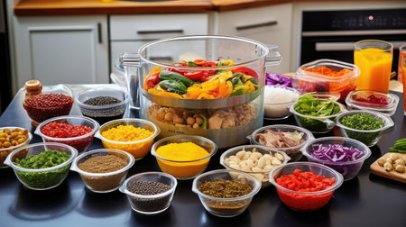 Diverse assortment of ingredients with fresh vegetables, grains, and spices on kitchen counter. That the image is generated using AI.