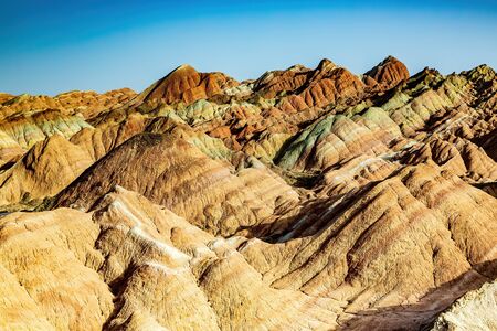 Amazing scenery of Rainbow mountain and blue sky background in sunset. Zhangye Danxia National Geopark, Gansu, China. Colorful landscape, rainbow hills, unusual colored rocks, sand