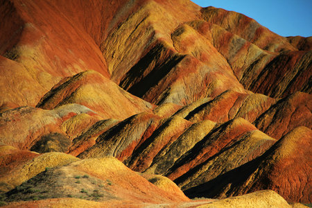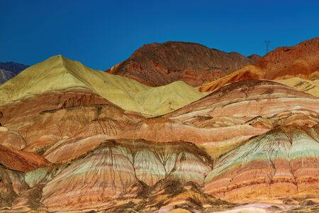 Amazing scenery of Rainbow mountain and blue sky background in sunset. Zhangye Danxia National Geopark, Gansu, China. Colorful landscape, rainbow hills, unusual colored rocks, sandstone erosion