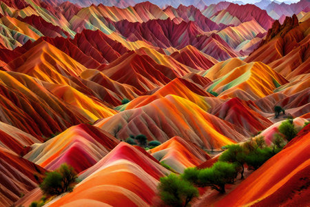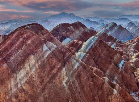 rainbow hilly landscape at dusk in zhangye danxia national geological park, gansu province, China.