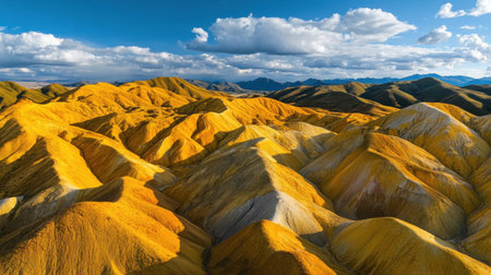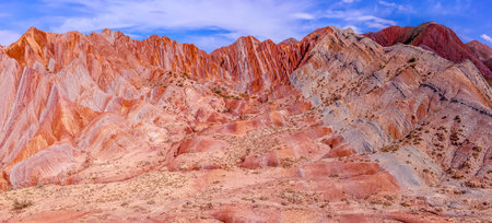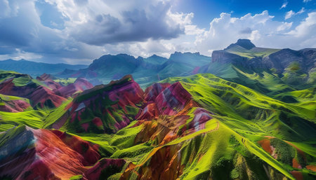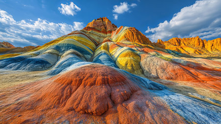 Experience the stunning beauty of mountainous landscapes featuring unique geological formations in vibrant colors under a clear blue sky with fluffy clouds.