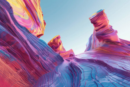 A digital illustration of a colorful, abstract landscape with rock formations rendered in vibrant colors.