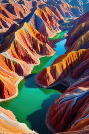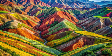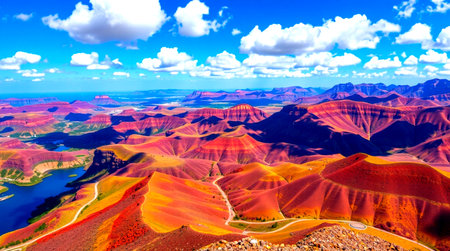 An aerial view of a colorful mountain range. Generative AI image.