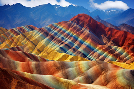 Colorful mountain range with vibrant bands of red, yellow, and blue layers.