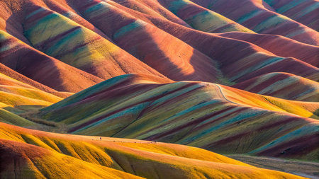 rainbow mountain in sunset with shadow of tourists on zhangye danxia national geological park, gansu province, China.