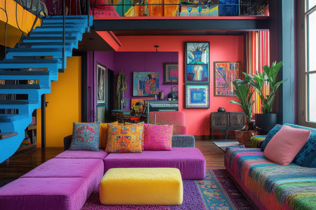 A lively living area filled with bright colors and eclectic decor. The space showcases a colorful staircase, modern furniture, vibrant cushions, and carefully arranged artwork on the walls.