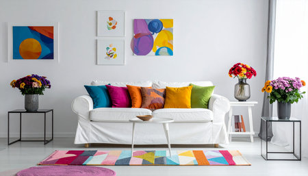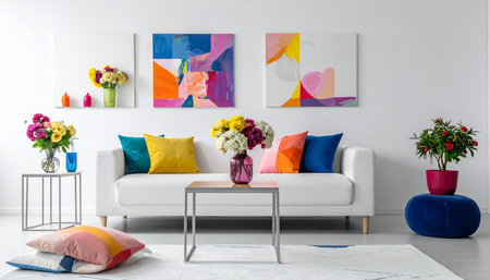 Living room interior with a white sofa and colorful paintings on the wall
