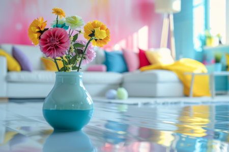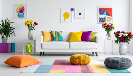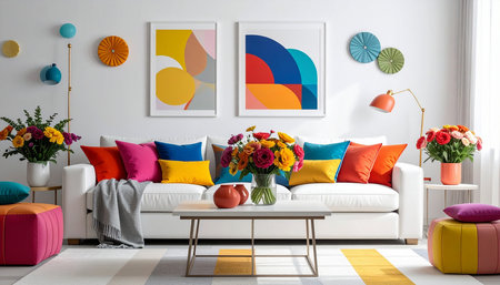 Interior of a contemporary living room with bright colorful furniture and decorative items