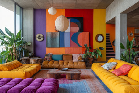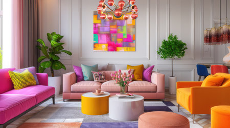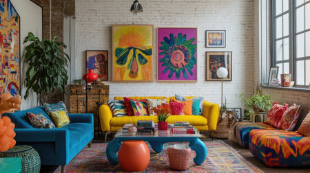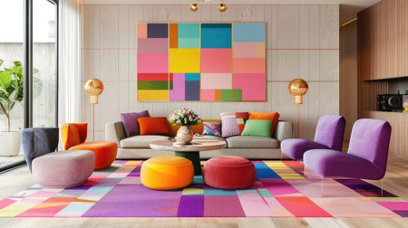 This vibrant and colorful living room features modern decor, abstract artwork, and playful furniture styles, creating a cheerful and inviting atmosphere.