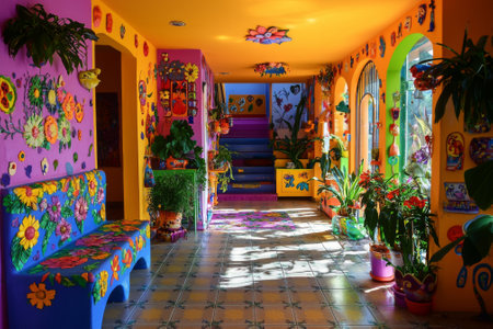 Vibrant hallway adorned with colorful floral decorations in a lively artistic space