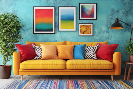 Modern interior design with yellow sofa, colorful pillows, abstract paintings and turquoise wall