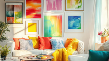 A vibrant living room showcasing a mix of colorful artworks, cozy furniture, and lush plants, illuminated by sunlight, perfect for a modern home ambiance.
