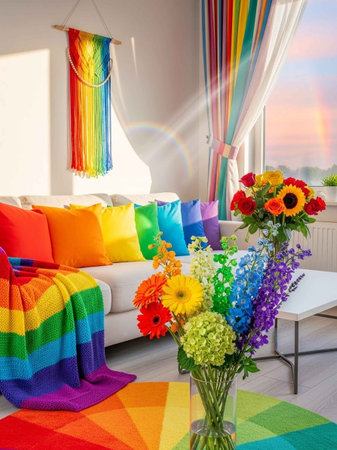 Colorful cushions on the sofa in the living room with a rainbow