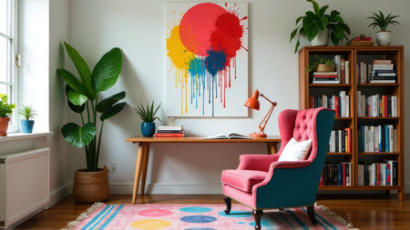 Stylish Home Office with Colorful Artwork and Comfortable Armchair, generative Ai