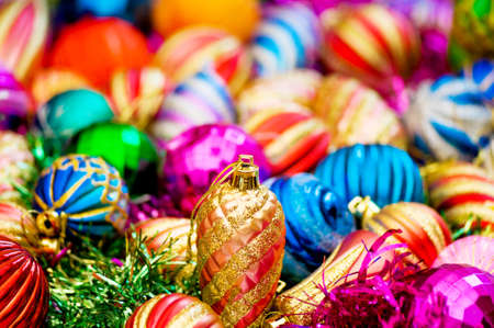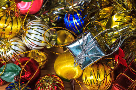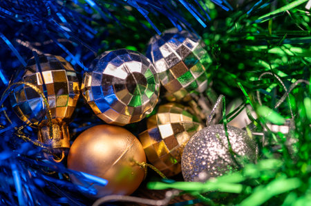 Shiny balloons and colorful tinsel elements of Christmas tree decoration, Close-up, selective focus. New year and christmas