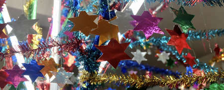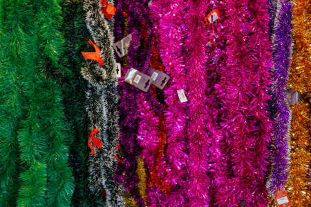 Decorative Christmas tinsel. Decor for the New Year. Background with copy space for text. Illustrative editorial. December 18, 2021 Balti Moldova.