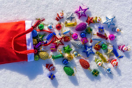 Red bag with many colorful new year toys lying on white fresh snow. Santa Claus scattered bag of gifts. Merry Christmas and Happy New Year. Greeting card for winter holidays. Top view.