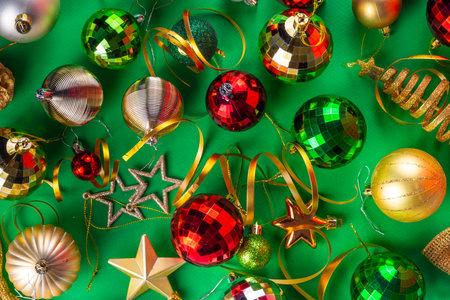 Bright green Christmas New Year background with red, green, golden xmas balls, streamers and decorations, top view copy space. Christmas and New Year greeting card flat lay