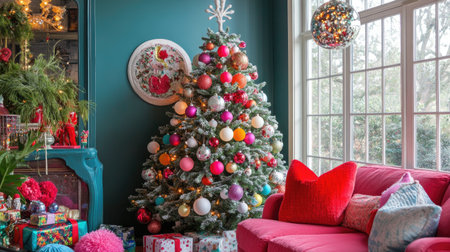 A vibrant Christmas living room scene featuring a beautifully decorated tree, colorful ornaments, and cozy furnishings, creating a warm holiday atmosphere.