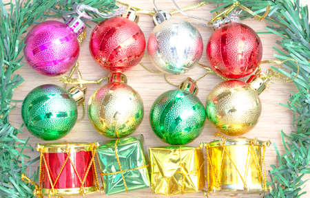 Christmas colorful collection, balls and decorative ornaments, on white wooden background.