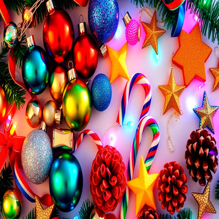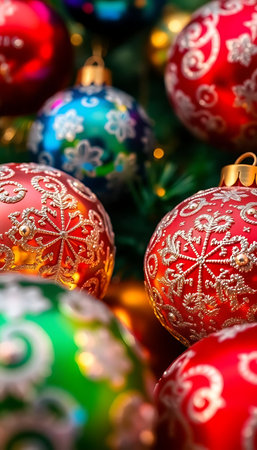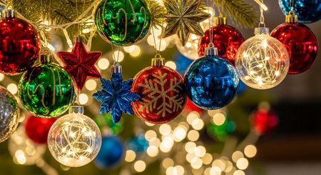 Festive Christmas tree decorations with vibrant baubles, tinsel, and twinkling lights captured in a close-up, ideal for a warm New Year's Card background