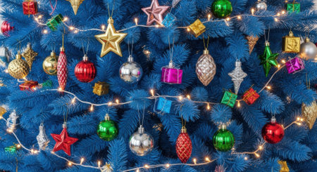 A close-up view of a uniquely decorated blue Christmas tree featuring a variety of colorful ornaments, stars, and glowing string lights creating a festive holiday atmosphere.