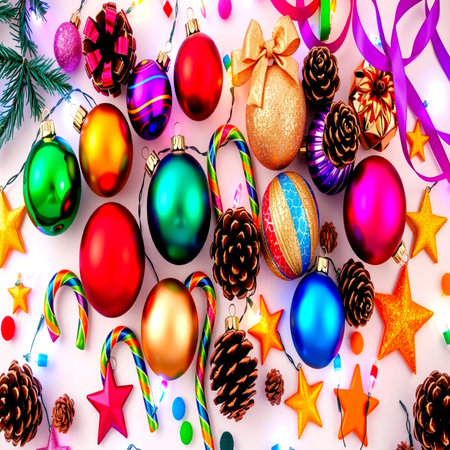 Christmas vibrant colorful wallpaper background texture of balls and decorations for the celebration tree.