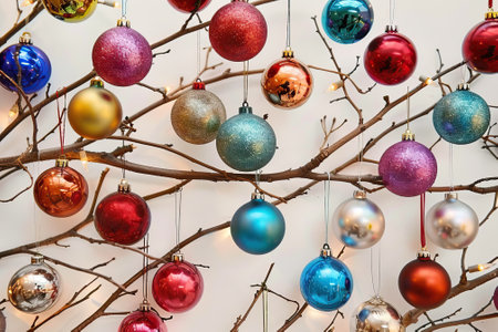 Colorful Christmas ornaments hanging from branches against a bright background.