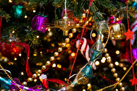 Closeup view of many beautiful christmas or new year fir tree decoration colorful toys.