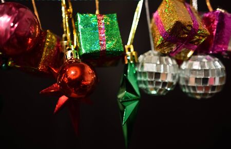 Colorful christmas baubles on dark background. Selective focus.