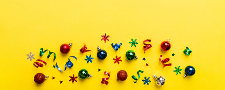 Christmas ball decoration on yellow background. Colorful blur bokeh background. christmas background