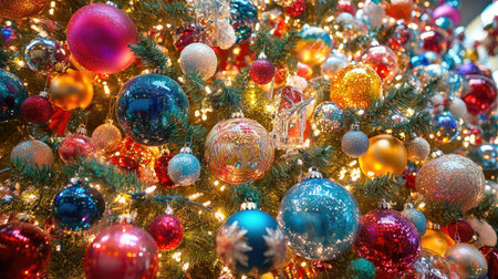 A festive and vibrant close-up view of a Christmas tree adorned with a variety of shiny ornaments and twinkling lights, creating a warm and joyful holiday atmosphere.