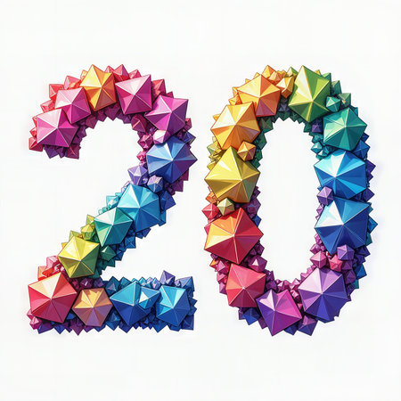 Vibrant 20th birthday numbers made of multicolored geometric shapes against a white background.