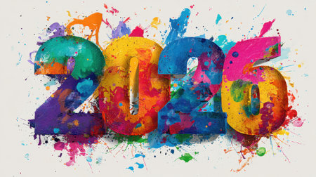 A vibrant illustration featuring the year 2026 formed with bold colors and dynamic paint splashes, perfect for celebrations, events, or inspirational purposes.