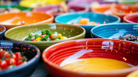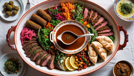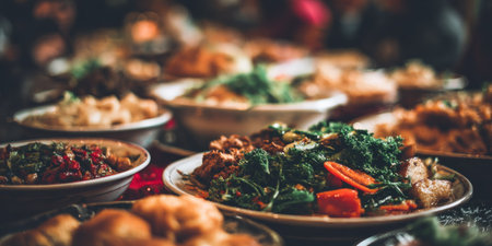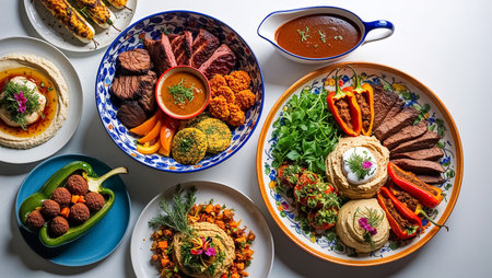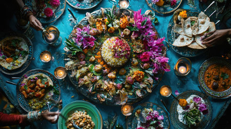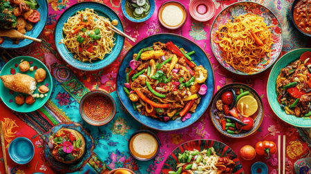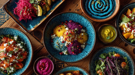 This stunning image showcases a vibrant assortment of colorful dishes spread across a festive table, perfect for cultural celebrations or gourmet dining experiences.