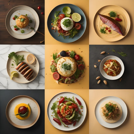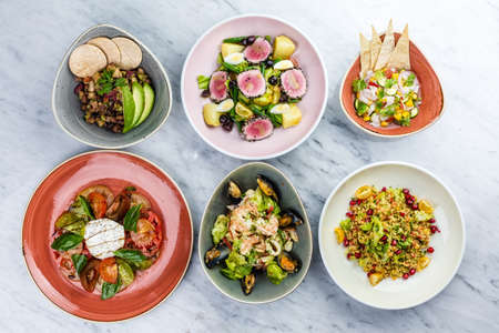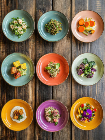 An overhead view displays multiple plates of food with various dishes. The composition features diverse food items and ingredients, showcasing color and texture. The lighting appears soft, indicating an indoor setting. This image is suitable for culinary and lifestyle-related projects, including editorial features and advertisements.