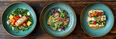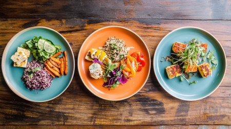 Enjoy a delightful meal showcasing colorful plant-based dishes with quinoa, tofu, and fresh vegetables on a rustic wooden table.