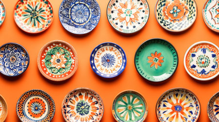 A stunning arrangement of colorful ceramic plates featuring intricate designs on a vivid orange background. This composition highlights the beauty of handcrafted artistry.