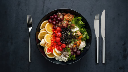 Healthy salad with fresh vegetables and fruits on black background, top view
