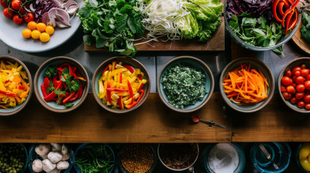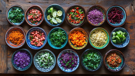 A beautiful arrangement of colorful ingredients in bowls showcases vibrant freshness. Ideal for cooking, food preparation, and culinary inspiration.
