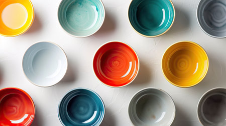 Assortment of colorful ceramic bowls on clean white background, vibrant and practical