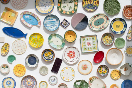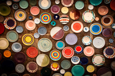 Collection of colorful Portuguese ceramic pottery, local craft products from Portugal. Ceramic plates display in Portugal. Colorful of vintage ceramic plates in Sagres, Portugal.