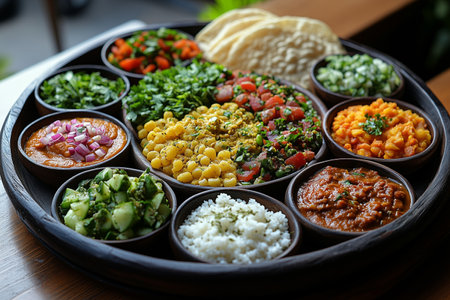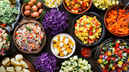 A colorful healthy food spread with vibrant vegetable dishes and dips served on rustic wooden table, creating inviting and fresh meal experience
